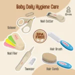 4 in 1 Nail grooming set consists of scissors, clipper, tweezer and filer and the 2 in1 Hair grooming set consists of baby comb & brush