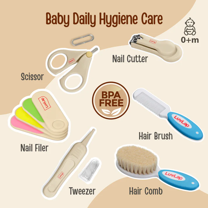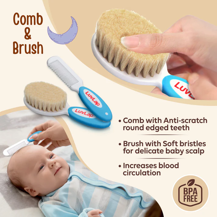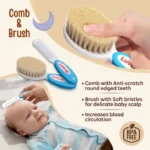 rounded edges of sissors to avoid prick in delecate skin. The natural bristles of the hair brush gently brush baby’s scalp